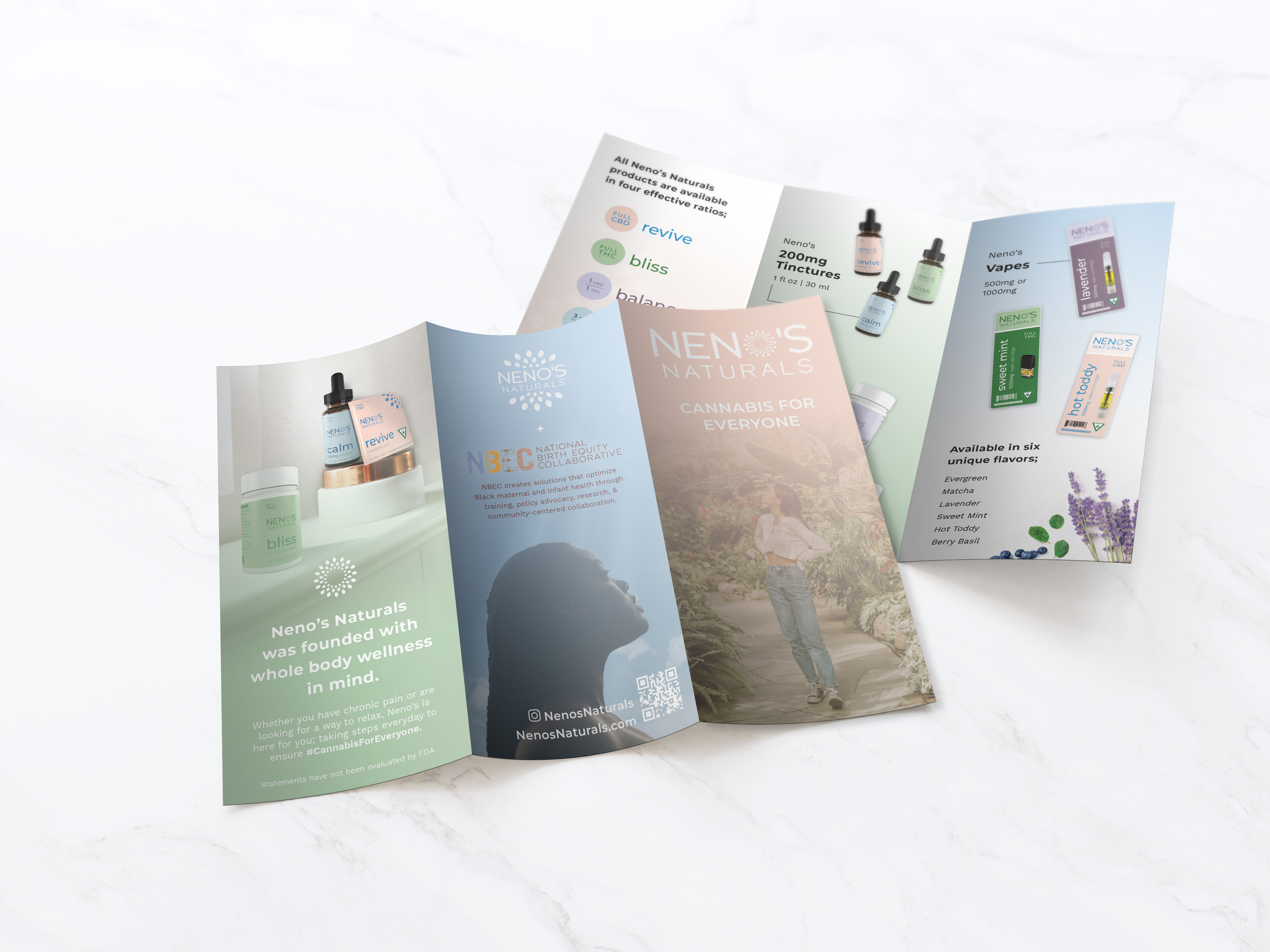 In-depth research was conducted into the wellness and CBD industries to create a brand that aligns with Neno’s Naturals’ commitment to natural and sustainable health solutions. The branding system for Neno’s Naturals was designed to be clean, modern, and approachable, emphasizing the brand’s dedication to quality, inclusivity, and trust. Natural and soothing colors were selected to evoke a sense of calm and wellness. Modern, clean typefaces were chosen to convey professionalism and trustworthiness.