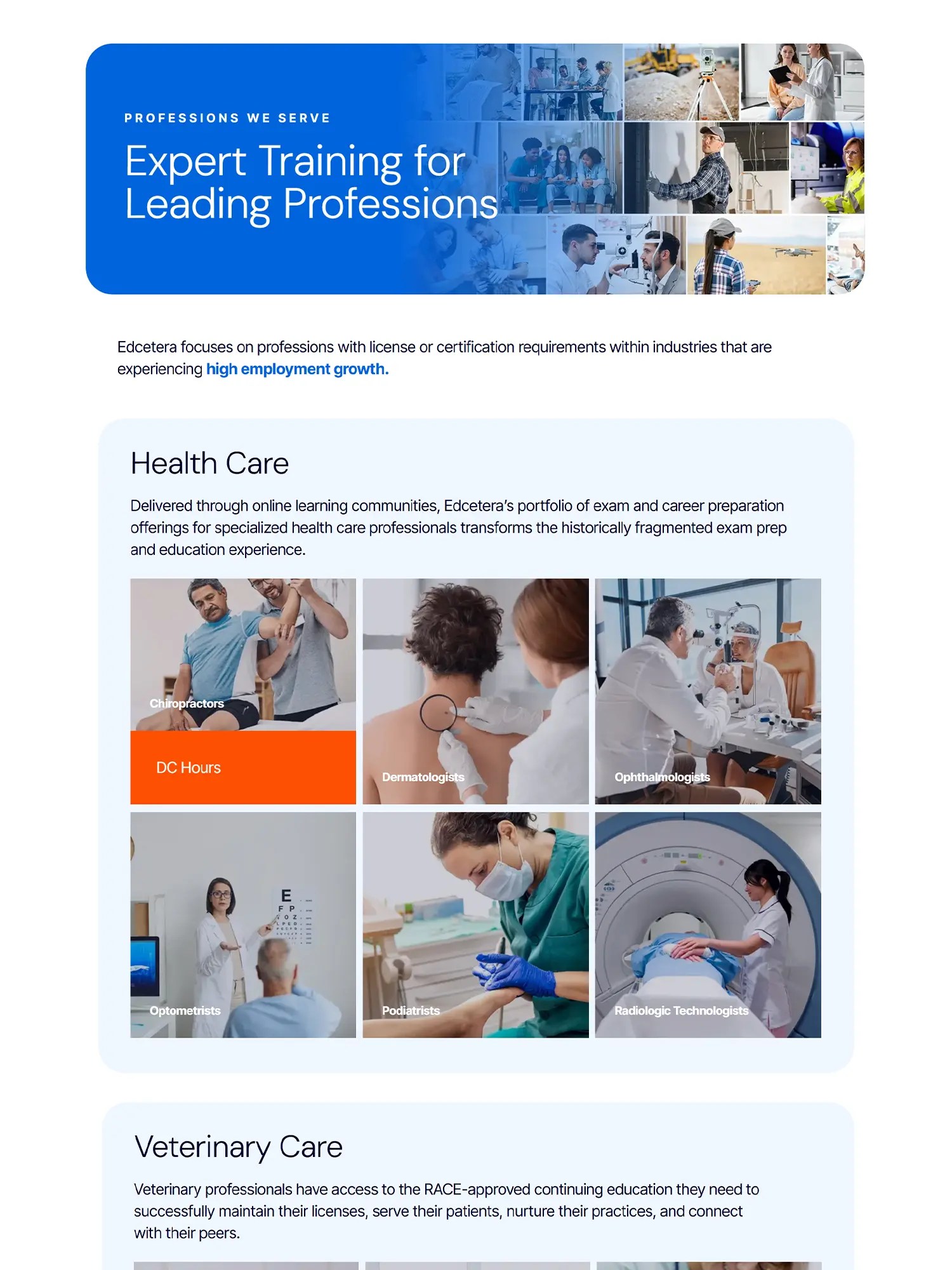 Edcetera is a professional education provider offering exam prep, CE, and career support for licensed professionals and institutions across healthcare, skilled trades, and more. The organization sought a website refresh to better reflect their evolving mission, clarify user experience, and support growth through more strategic content hierarchy and visual design.