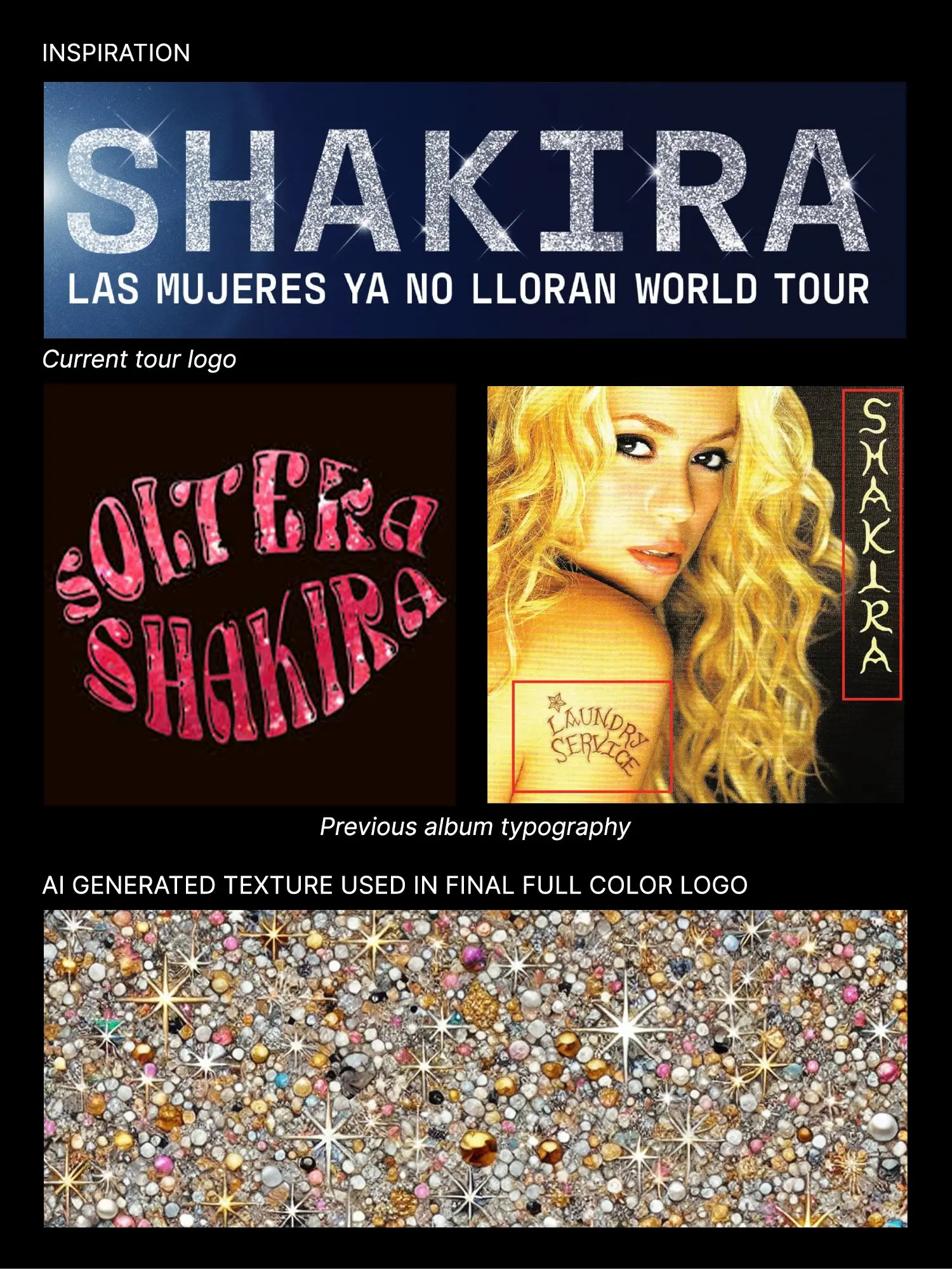 The primary challenge was to design a logo that captured Shakira’s iconic charisma and the band’s energetic performances while infusing a feminine and playful tone. It needed to strike a balance between dynamic energy and luxurious sophistication, incorporating rich textures and embellishments to elevate the design. Additionally, the logo had to remain versatile and impactful across various applications, from stage visuals and merchandise to digital platforms.